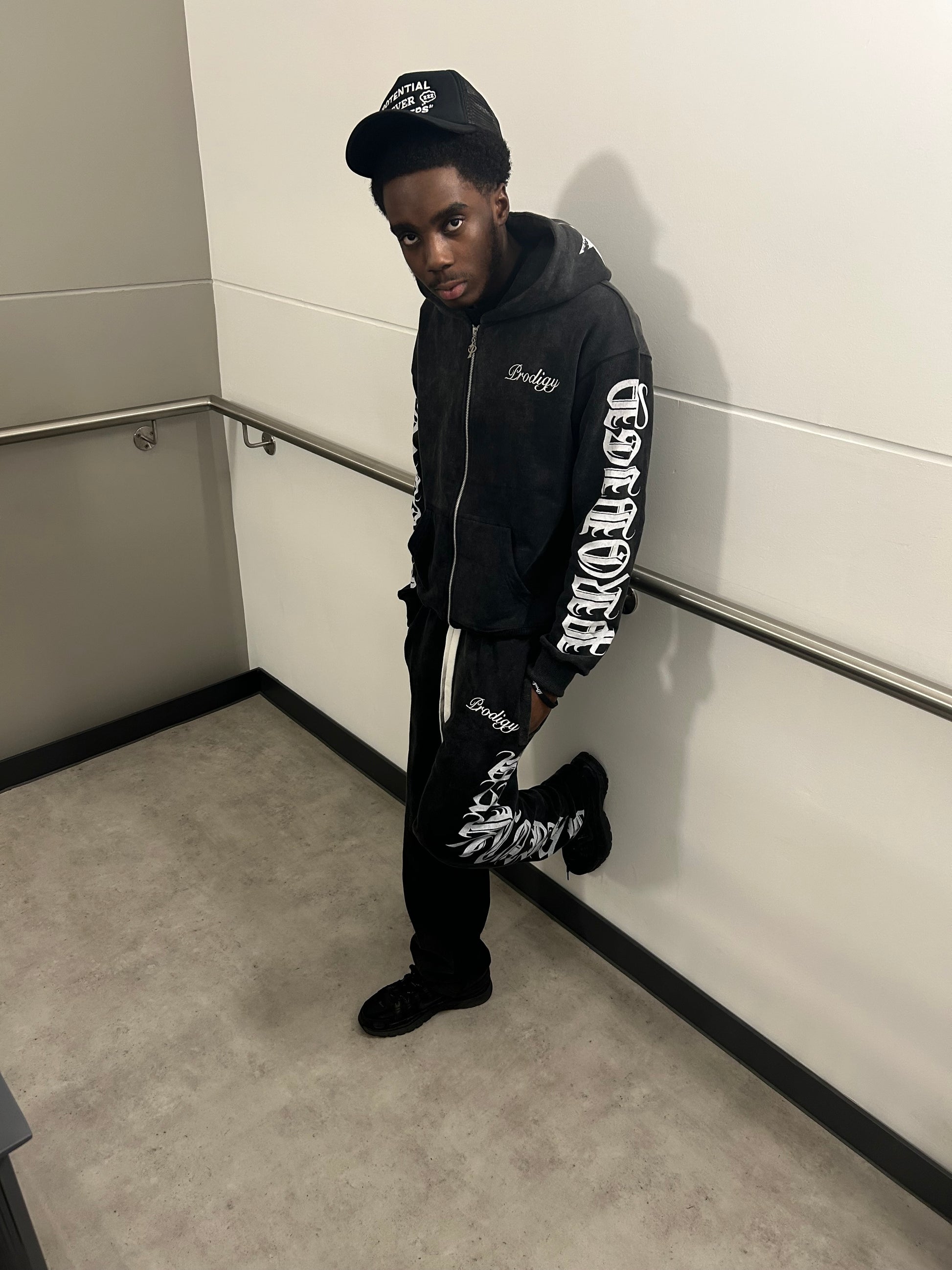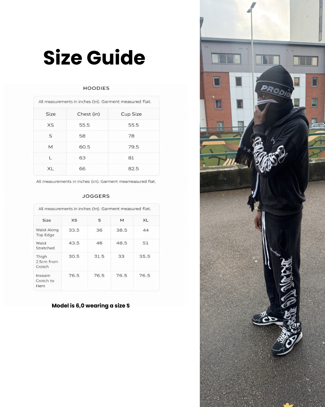 The matching joggers are cut with a relaxed yet tapered fit, finished with extended Prodigy script branding down the leg. An adjustable drawstring waist ensures comfort, while the all-black base keeps the look clean and timeless.