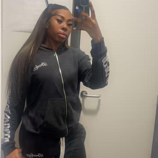 The zip-up hoodie features our embroidered Prodigy script on the chest, paired with bold sleeve detailing that makes a statement from every angle. Designed to be worn layered or zipped for a sharper, more defined silhouette.